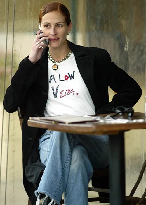 In 2002, Julia Roberts’s then-boyfriend (now husband) Danny Moder was still married to his first wife, Vera Steimberg. Vera reportedly refused to sign divorce papers, so Julia stepped out in this DIY t-shirt (ft. an…attempted pun? Strange to bring a soothing evergreen plant into this but go off, Jules). Months later, Vera capitulated and Julia and Danny tied the knot in New Mexico. Julia got some flack for this low blow but later told Oprah “I stand by my t-shirt.” Very Julianne Potter in My Best Friend’s Wedding coded.