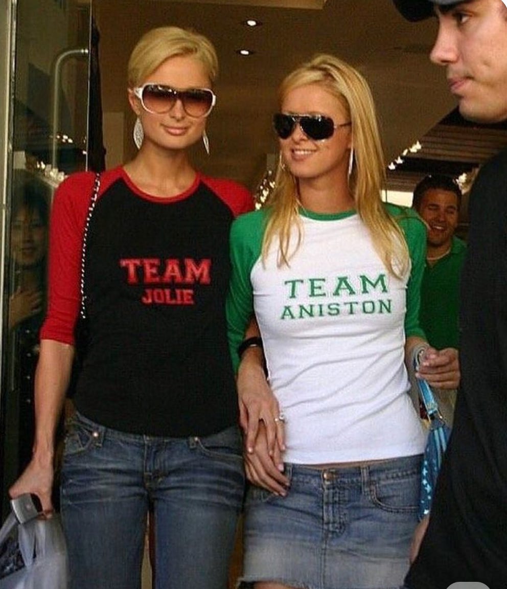 Team Jolie vs. Team Aniston walked so Team Jeremiah vs. Team Conrad could run. Kitson, the Von Dutch studded LA boutique I pored through at age 17 under the guise of visiting California colleges, made these shirts in the wake of Brad Pitt and Jennifer Aniston’s 2005 divorce and his subsequent (er, concurrent) relationship with his Mr. and Mrs. Smith costar. Paris & Nicky Hilton bring sibling rivalry to a whole new level in this shot that, if you scratched it, would smell like Clinique Happy and Juicy Tubes lip gloss.