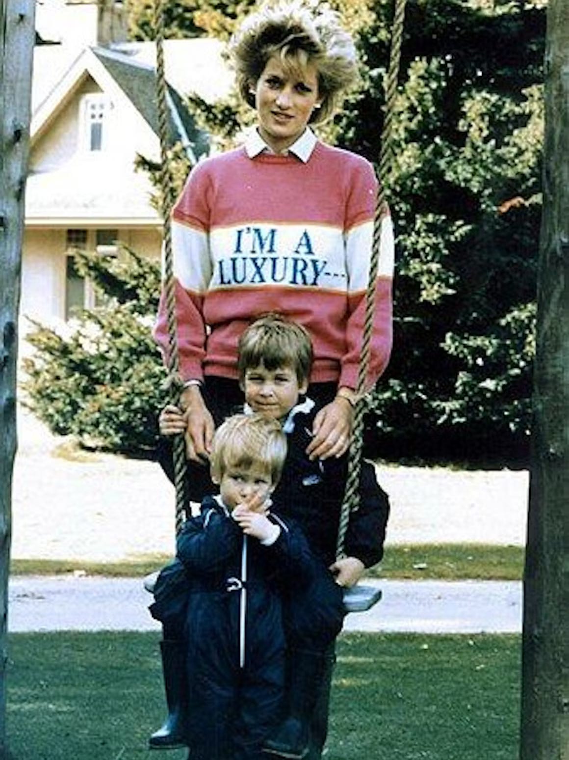 I own the remake of Princess Diana’s black sheep sweater, but this one is also iconic. The back says “FEW CAN AFFORD.” Prince Charles, who insisted on keeping three people in the marriage, was overdrafted.