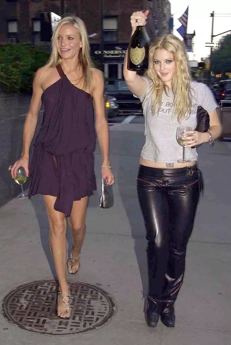 Cameron Diaz and Drew Barrymore en route to the Charlie’s Angels: Full Throttle premiere in 2003. Oh how I adore this picture, let me count the ways: the open (glass) containers and bottle cheers. The smoky eyes. The low-slung leather pants and butterfly tattoo. So much to love, so much to make you feel like you’re a few vodka Red Bulls deep and wearing a “going out top.” Drew’s choice: a “my boyfriend is out of town” tee—condolences to Fabrizio Moretti, Strokes drummer and Drew’s boyfriend at the time.