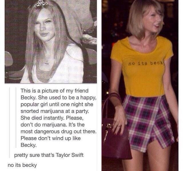This one’s evidence for the defense in any case that prosecutes Taylor Swift for taking herself too seriously. Swift stepped out in a “no it’s becky” shirt in 2014 after a viral Tumblr post (pictured at left). In the post, someone used an old pic of Tay to tell a fake, D.A.R.E.-adjacent story about their friend “Becky.” Anddd Taylor took their words right out of their mouth Tumblr.