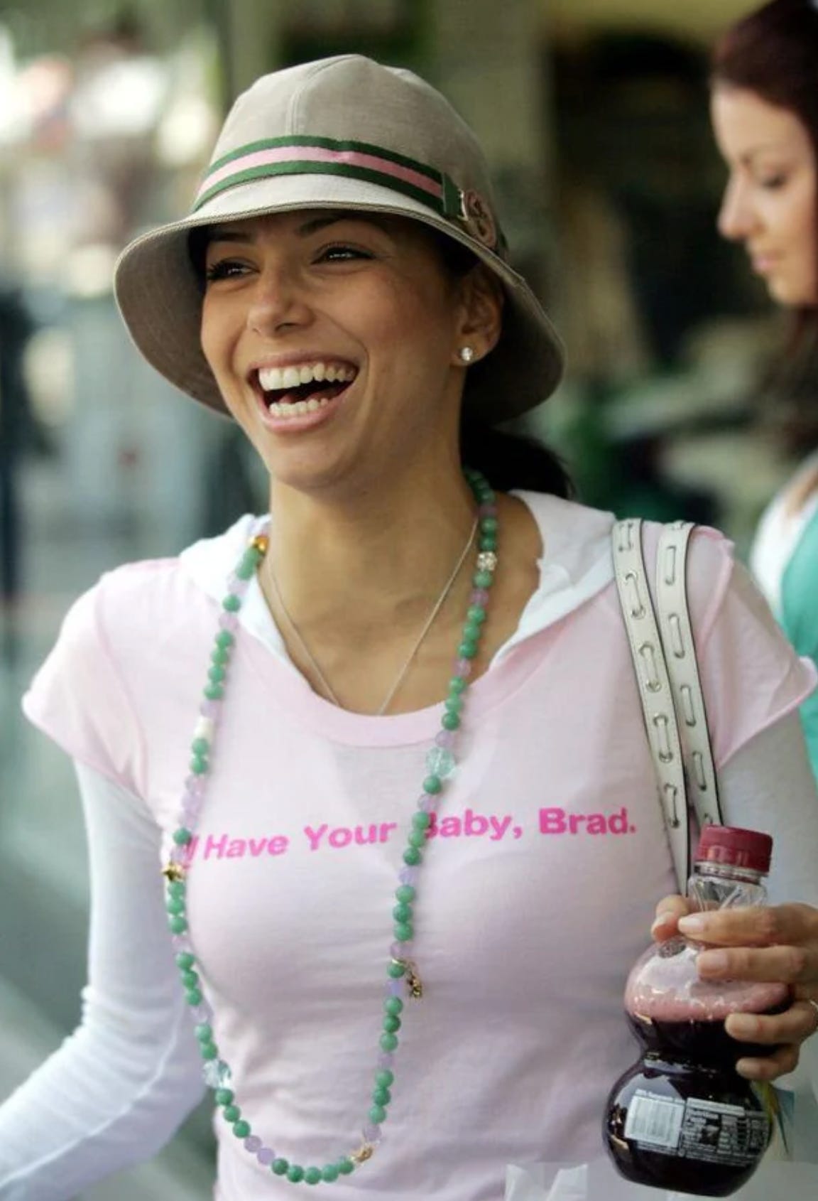 Desperate housewife, desperate message (for those whose reading comprehension is cut off by the early aughts apropos power beads, it says “I’ll Have Your Baby, Brad.”) Eva Longoria wore the shirt, also from Kitson, during the Team Jolie vs. Team Aniston frenzy in 2005 and has since apologized to Jennifer Aniston for this bold and slightly insane choice.