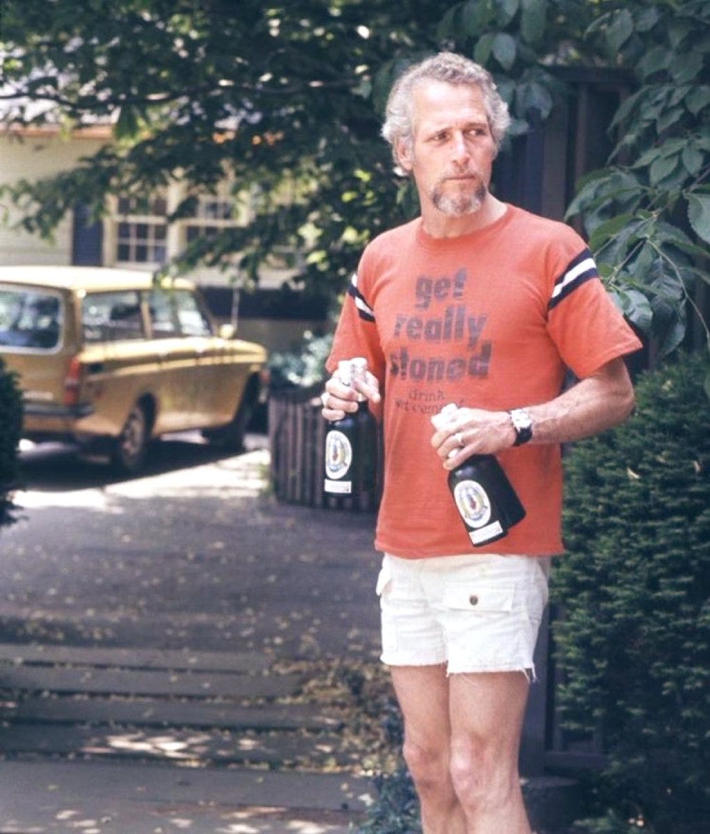 Paul Newman, King of Cool, wearing a “get really stoned, drink wet cement” tee while holding four beers at his Connecticut home in 1981. I felt like a stoner for not getting this right away. Then the joke became more concrete 😏