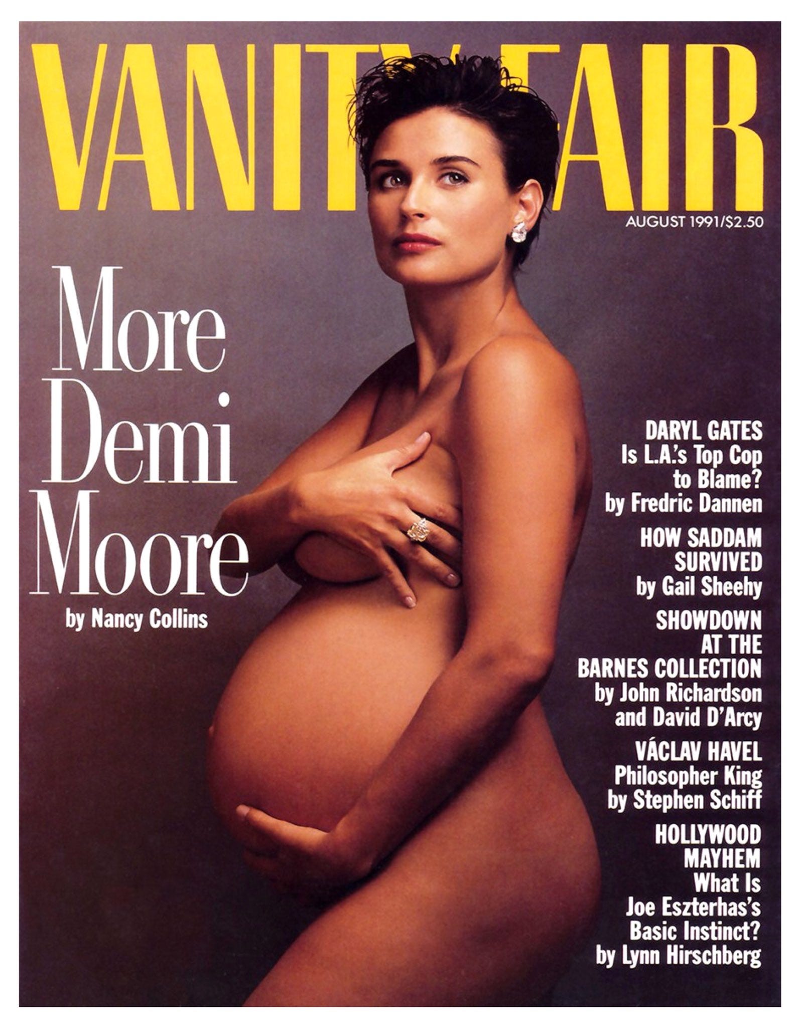 In 1991, Moore posed naked at seven months pregnant with her second child on the cover of Vanity Fair. MORE DEMI MOORE, the headline read. The iconic cover photo was taken by Annie Leibovitz as a last minute lark at the end of the shoot, something for Demi to bring home to her husband Bruce Willis. When the pictures were ready for review, VF editor Tina Brown insisted they send the nudes to the masses.